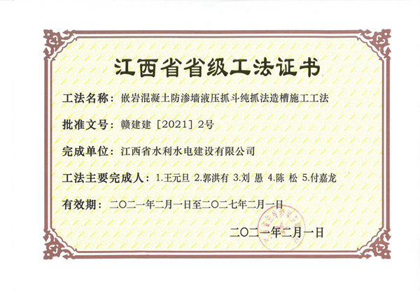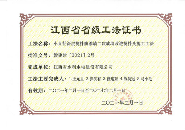 2021年2月1日,江西省住房和城鄉建設廳文件《關于公布我省2020年度第二批省級工程建設工法的通知》(贛建建〔2021〕2號)公布了2021年度第二批省級工程建設工法評審結果,其中,公司申報的《小直徑深層攪拌防滲墻二次成墻改進攪拌頭施工工法》、《嵌巖混凝土防滲墻液壓抓斗純抓發造槽施工工法》審定為“2020年度省級工程建設工法”。