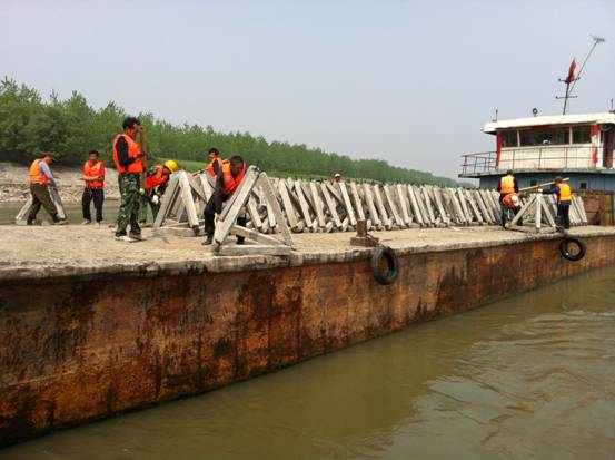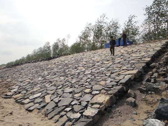 [注:九江長江江心洲固岸應急度汛工程,包括九江縣江新洲1標和彭澤縣棉船洲1標,由我公司中標承建。工程主要建設內容為拋石、砼四邊六面框架、干砌石護坡,項目總投資4000萬元。江新洲和棉船洲大堤共保護面積130.39 平方公里,保護耕地12.18萬畝,保護人口8.39萬人,圩區(qū)內土地肥沃,灌溉便利,是江西省的重要棉油生產基地。]