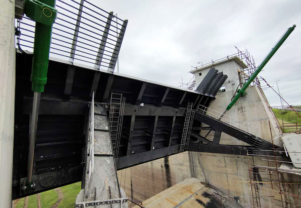 弧形閘門由3片門葉組成,重約70多噸。第一孔閘門的順利提升,鼓舞了項(xiàng)目全體人員的士氣,堅(jiān)定了大家眾志成城高質(zhì)量完成項(xiàng)目的決心。