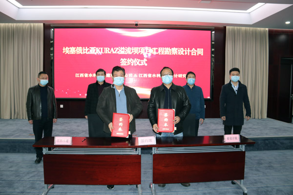 2月28日,我公司與江西省水利規劃設計研究院正式簽訂埃塞俄比亞kuraz溢流壩項目勘察設計合同。省設計院黨委書記江凌,副院長、黨委委員柯勁松,公司黨委書記、董事長王元旦,海外公司執行董事張周平等領導出席簽約儀式。 該合同的簽訂是雙方境外工程項目的再一次強強合作,為項目的順利推進奠定了良好的基礎。